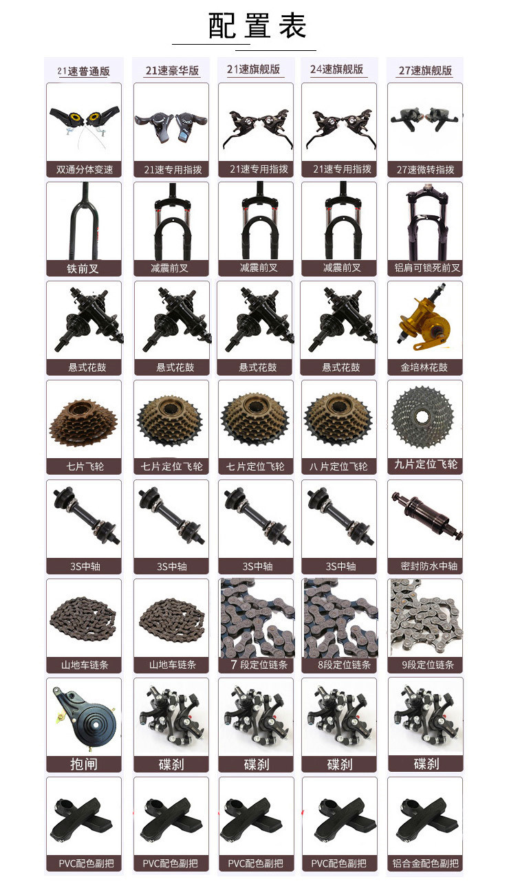 单速车,21速普通版,21速豪华版,21速旗舰版,24速旗舰版,27速豪华版,27速旗舰版。颜色:黑红色,白红色,黑蓝色,白蓝色