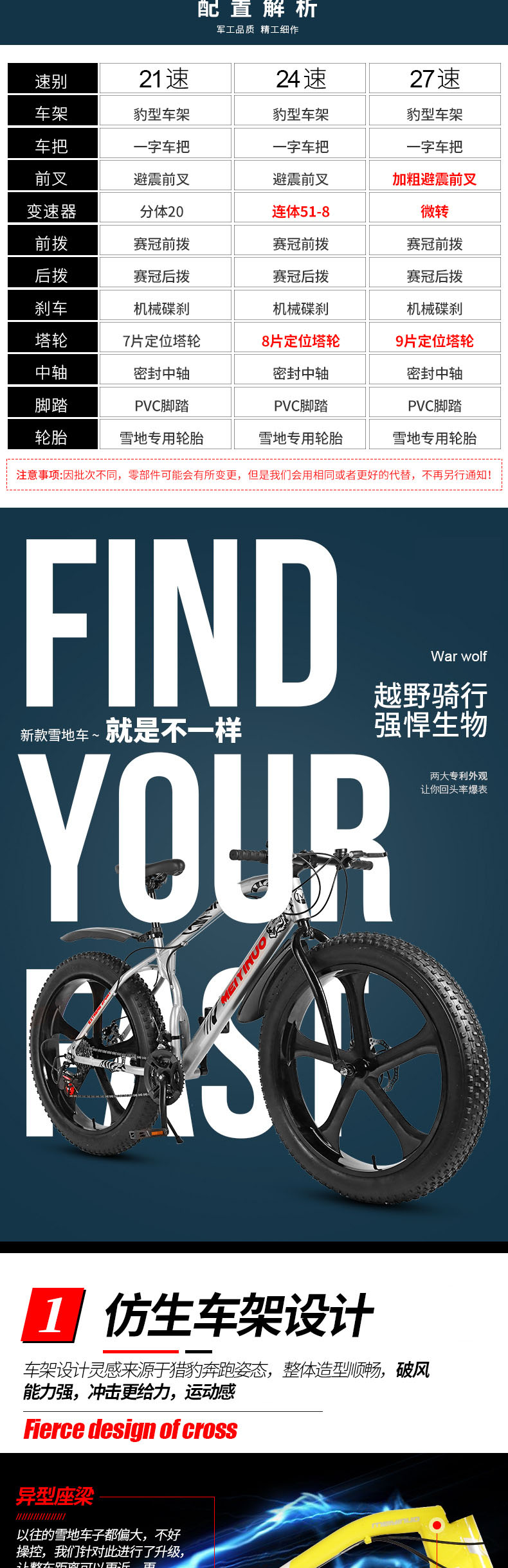 26寸双碟刹宽胎越野变速车自行车成人山地车雪地车沙滩车厂家供应