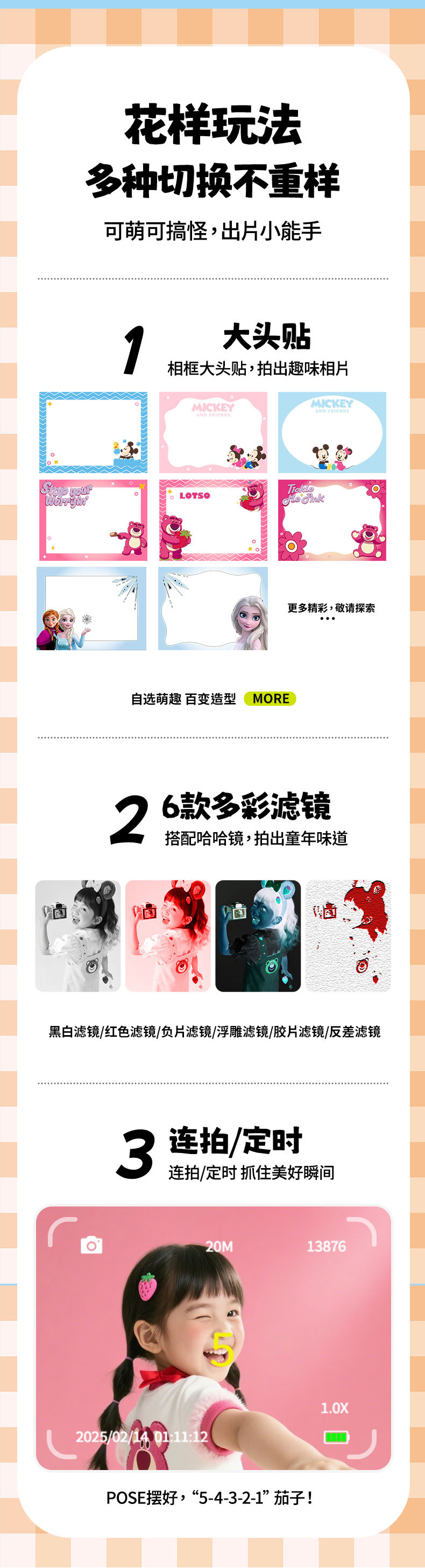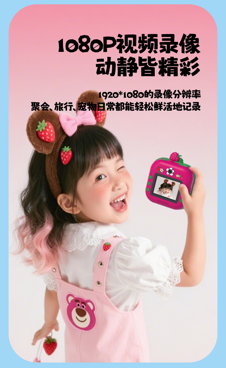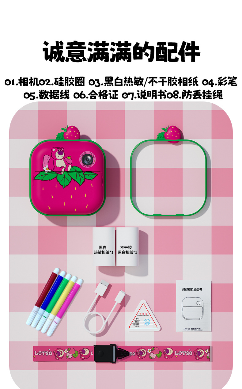 米妮相机,米奇相机,草莓熊相机,艾莎相机。32G内存卡,4卷彩色打印纸