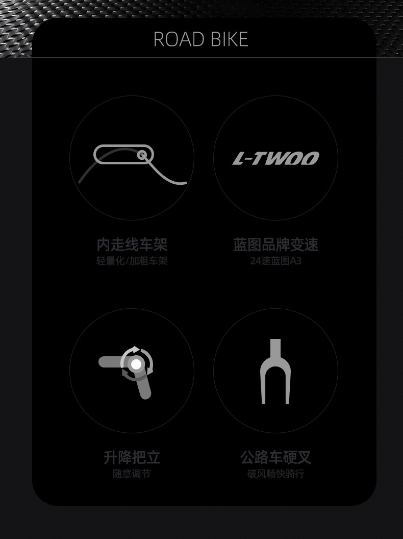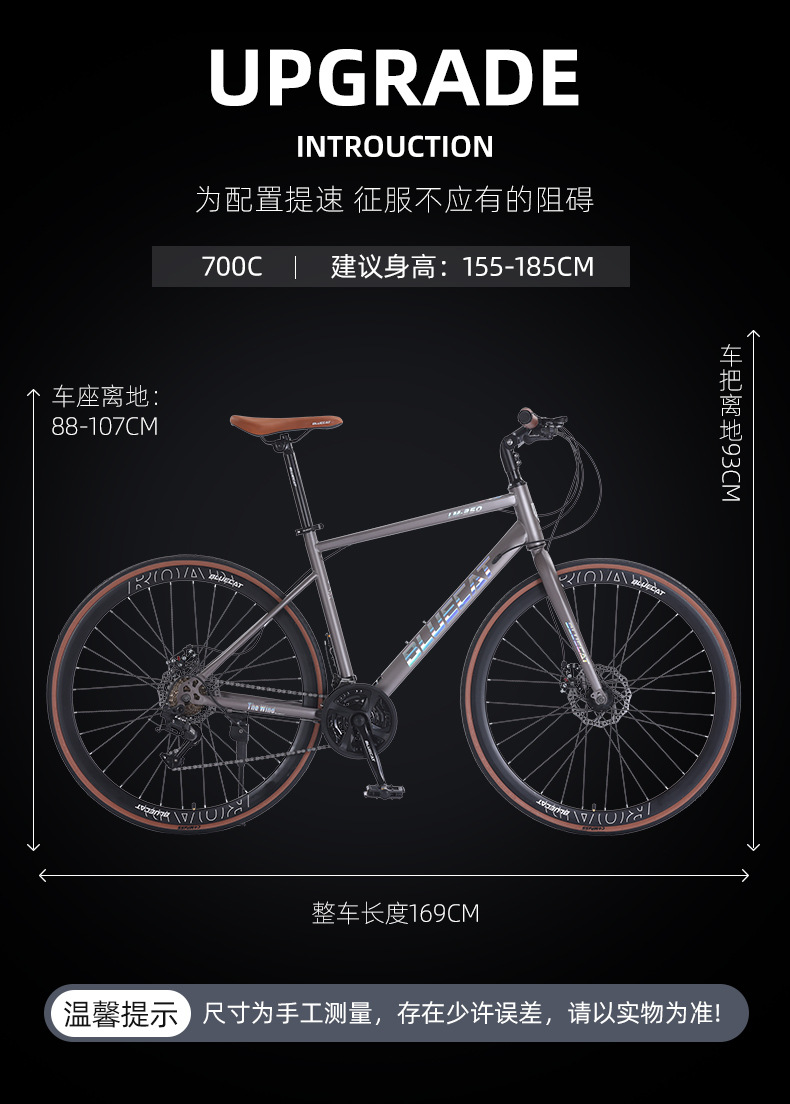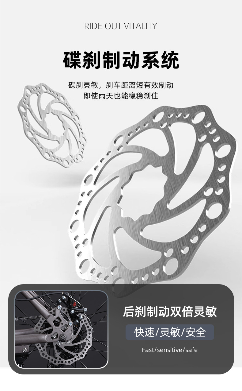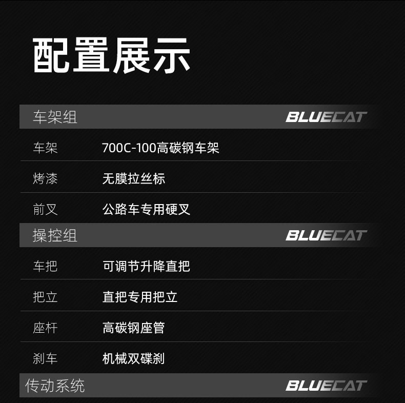 尺寸:24(英寸) 推进模式:链条 载重量:250kg(kg) 材质:碳钢车用途:运动车 车架结构:整体车 脚踏类型:普通脚踏制动系统:蓝图24速变速系统 车架类型:无尾车架前叉类型:无避震硬叉刹车类型:双碟刹款型:公路车 配置等级:高碳钢内走线车架