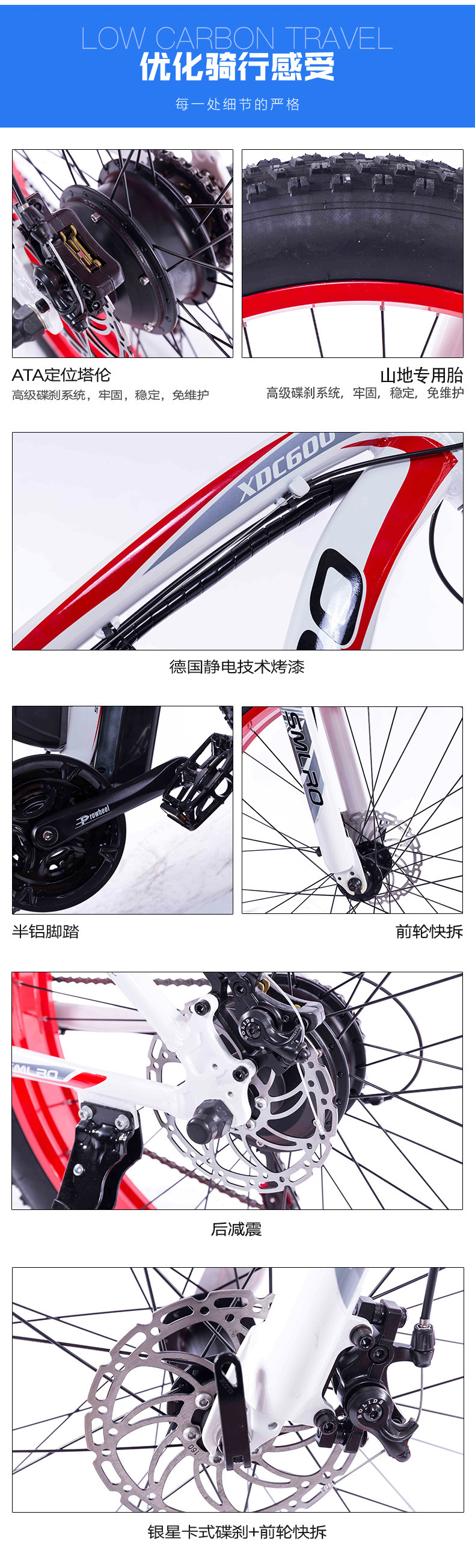 两培林花鼓中轴,禧玛诺21速变速器,铝合金锁死前叉,LED液晶显示仪表,助力传感控制器,欣豪无刷电机,台湾彰星高性能机械碟刹(前后碟刹)欧洲标准DC2A快速充电器