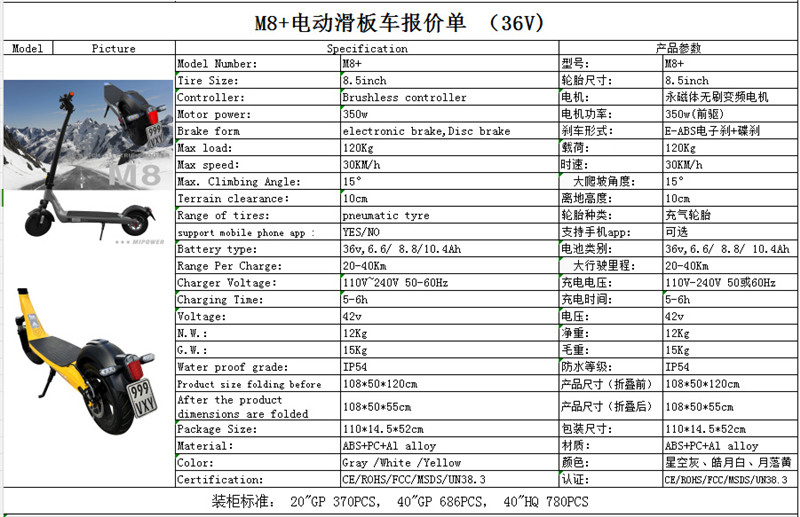 产品类别:电动滑板车适用人群:通用规格:8.5寸车轮材质:橡胶车体材质:铝合金车轮个数:2轮充电时间:4-6H电池容量:6.6/8.8/10.4高时速:30(km/h)带转向灯款、车身氛围灯 前减震
