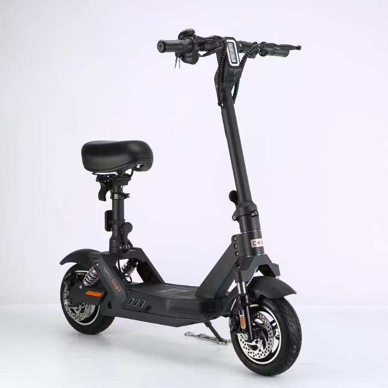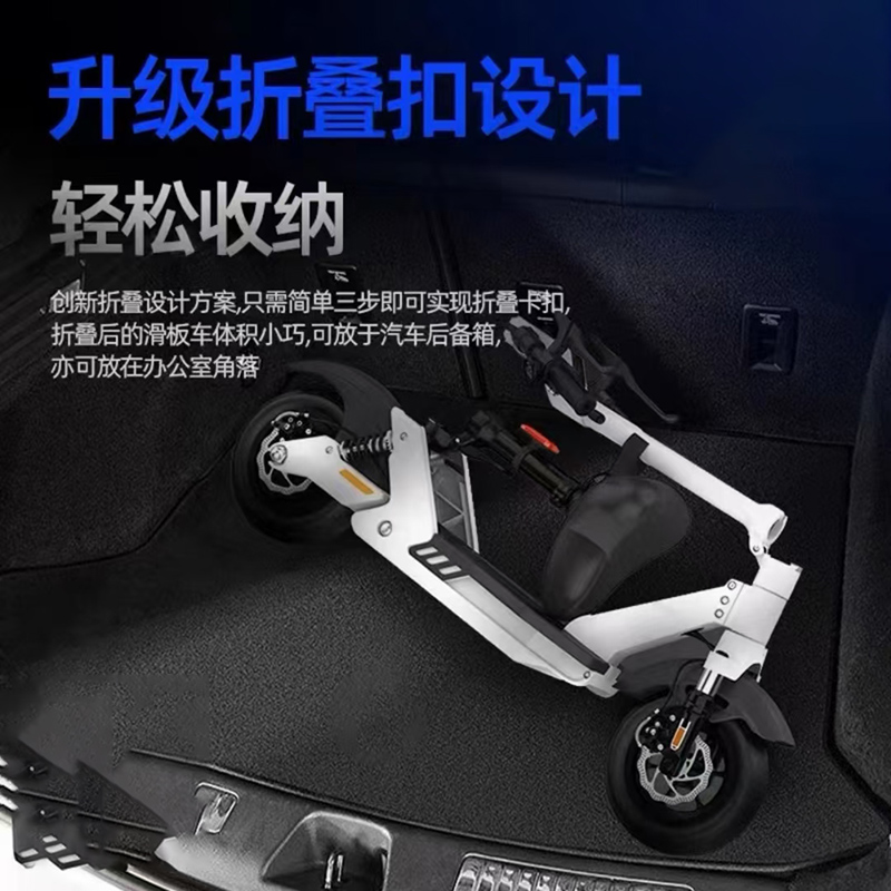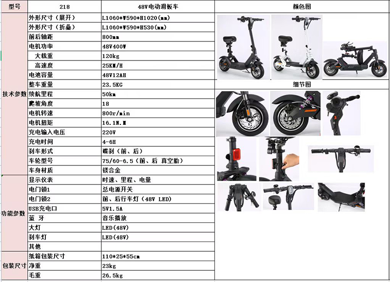 整车采用镁合金材质,配套48V12AH锂电池,续航50公里,载重120kg,前后减震,前后碟刹,