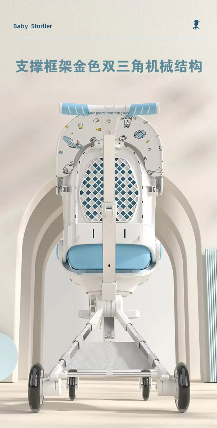 加厚加固的铝合金框架,一键折叠,舒适托盘,可调式遮阳篷,五点式安全带坐垫,可伸缩后推把手,仿真皮粒面面料,氧化工艺铝管材质,靠背三档可调,氧化工艺铝管管材质,耐磨发泡轮胎,前轮12cm,后轮17cm。