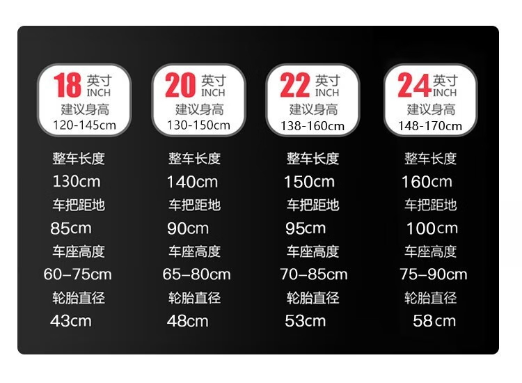 18寸【身高115-150cm】约5~8岁 20寸【身高130-150cm】约7~10岁 22寸【身高140-165cm】约9~12岁 24寸【身高155-175cm】约11~15岁