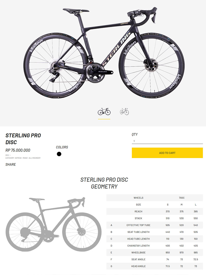 Pilihlah sepeda yang menawarkan geometri aerodinamis yang superior, kenyamanan yang optimal serta keamanan selama melaju dengan kecepatan maksimal. Yang kau inginkan, semuanya ada di Sterling Pro Disc. Sebuah sepeda balap dengan geometri profesional yang telah diuji dan diverifikasi oleh para pebalap sepeda handal, menjadikan Sterling Pro Disc terdepan di kelasnya. Hadir dengan rangka berbahan carbon yang sangat ringan, dilengkapi dengan groupset top-level, serta sistem pengereman Hydraulic Disc Brake, sepeda allrounder nomor satu di kelasnya ini menyajikan pengalaman terbaik dalam hidupmu akan menjadi kenyataan.
