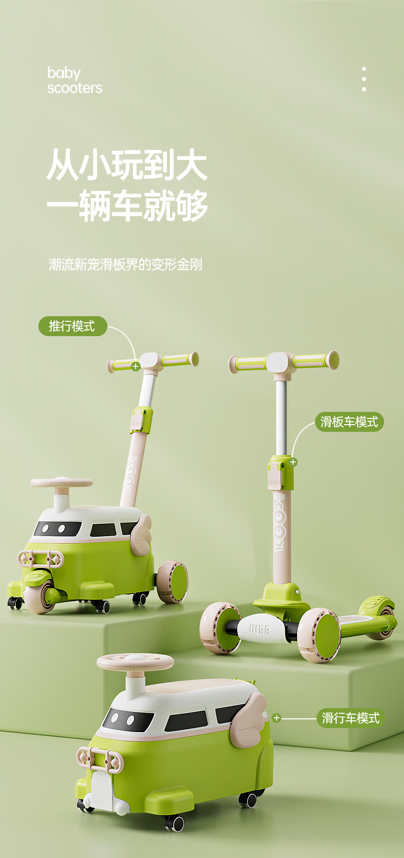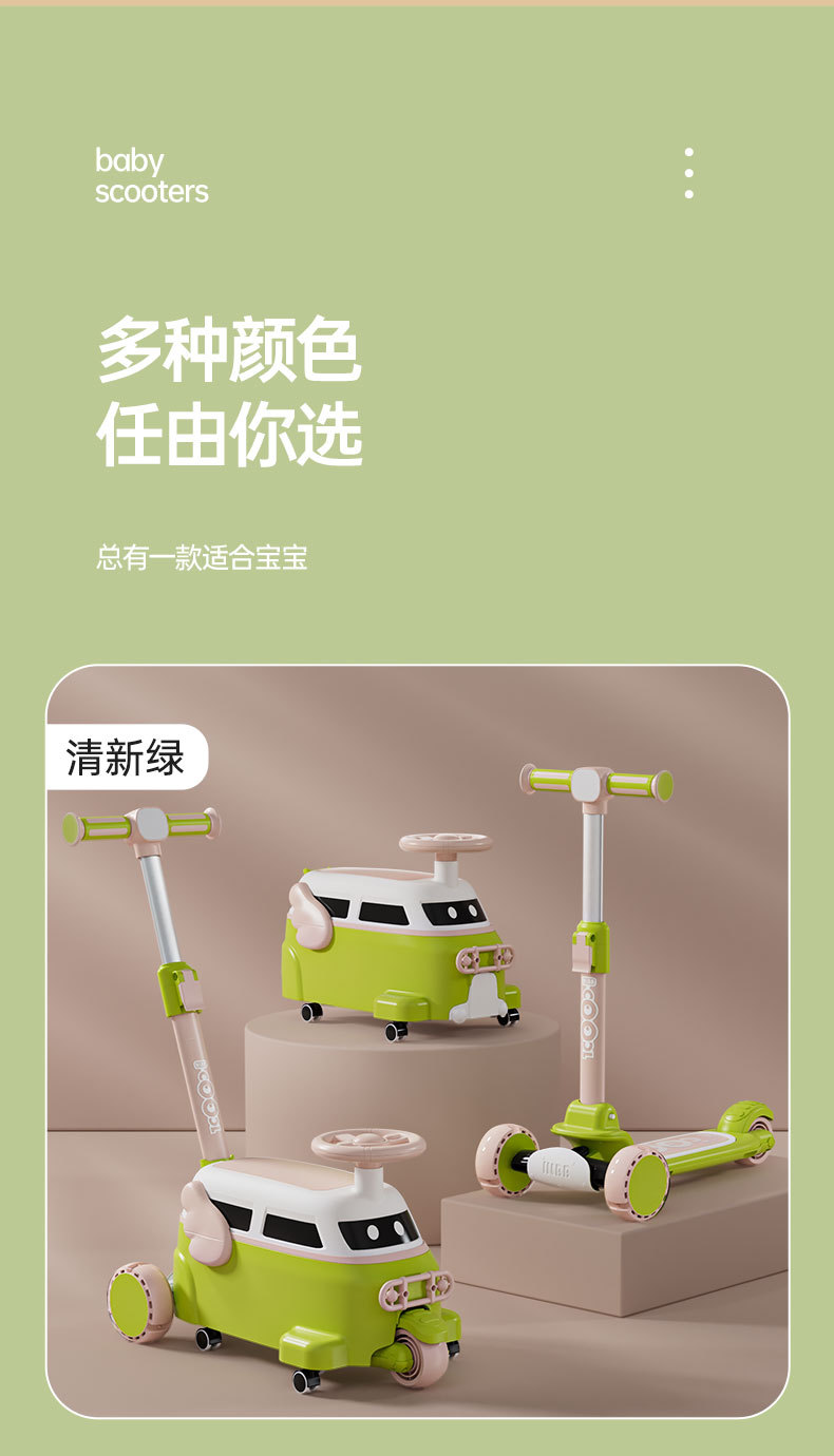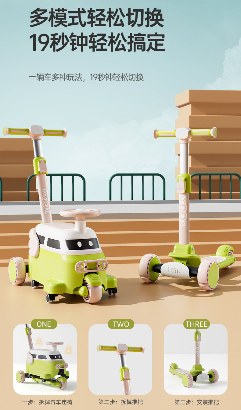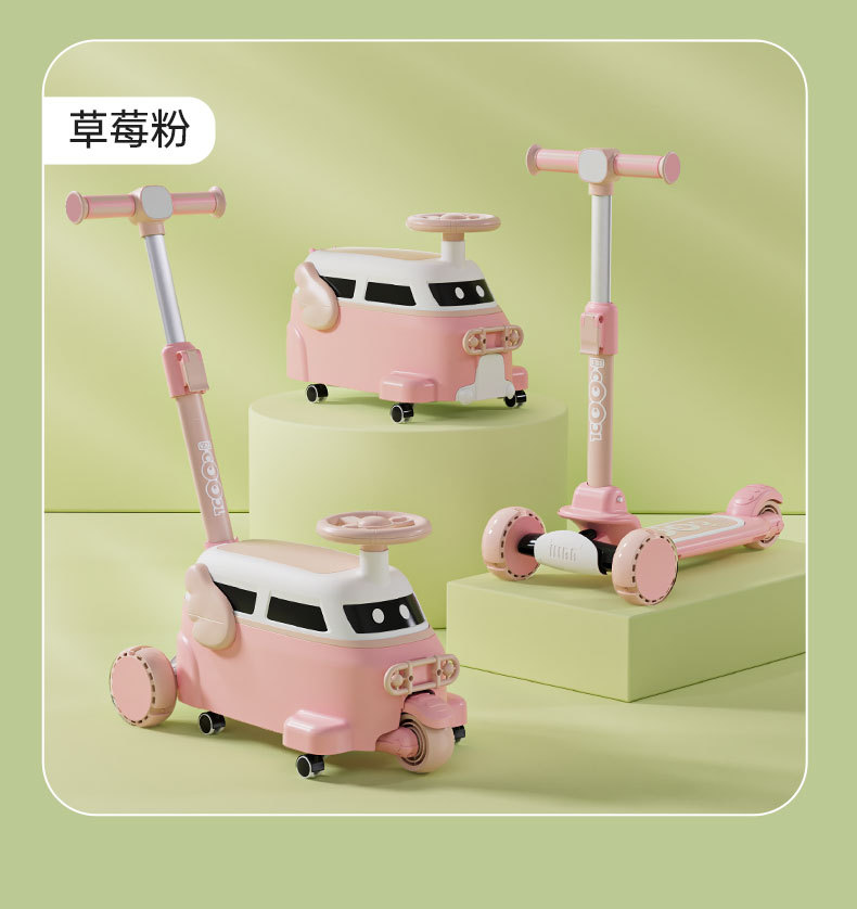 【暮夕粉/油果绿/深海蓝-滑行车】+大储物箱+万向轮,【滑板车】+稳静音闪光轮+一件折叠+升降调节,【三合一】+[溜溜车+滑板车+手推车]