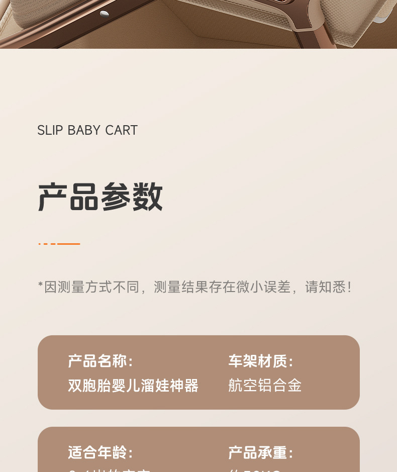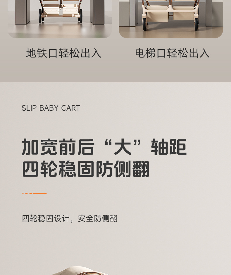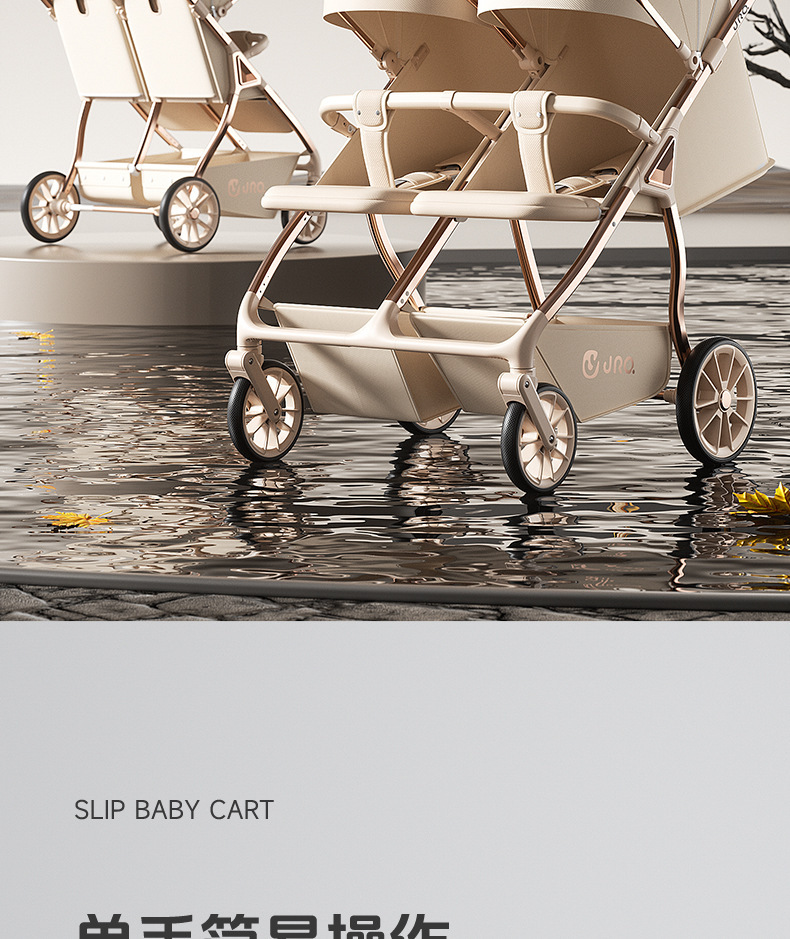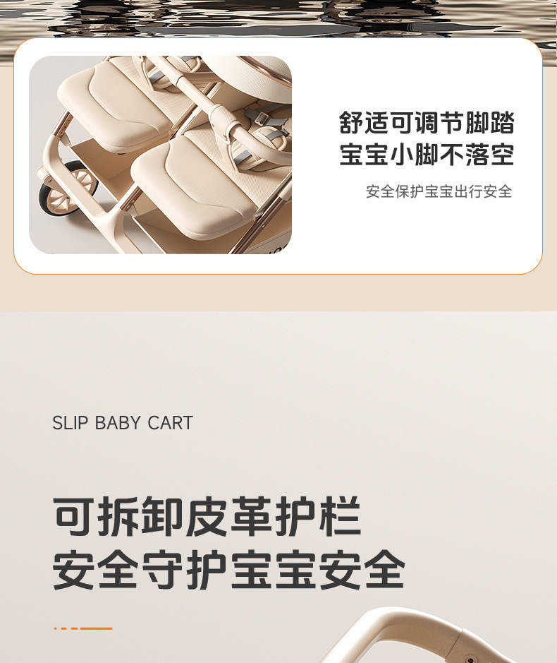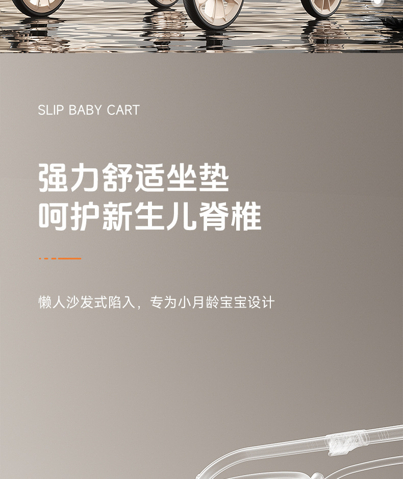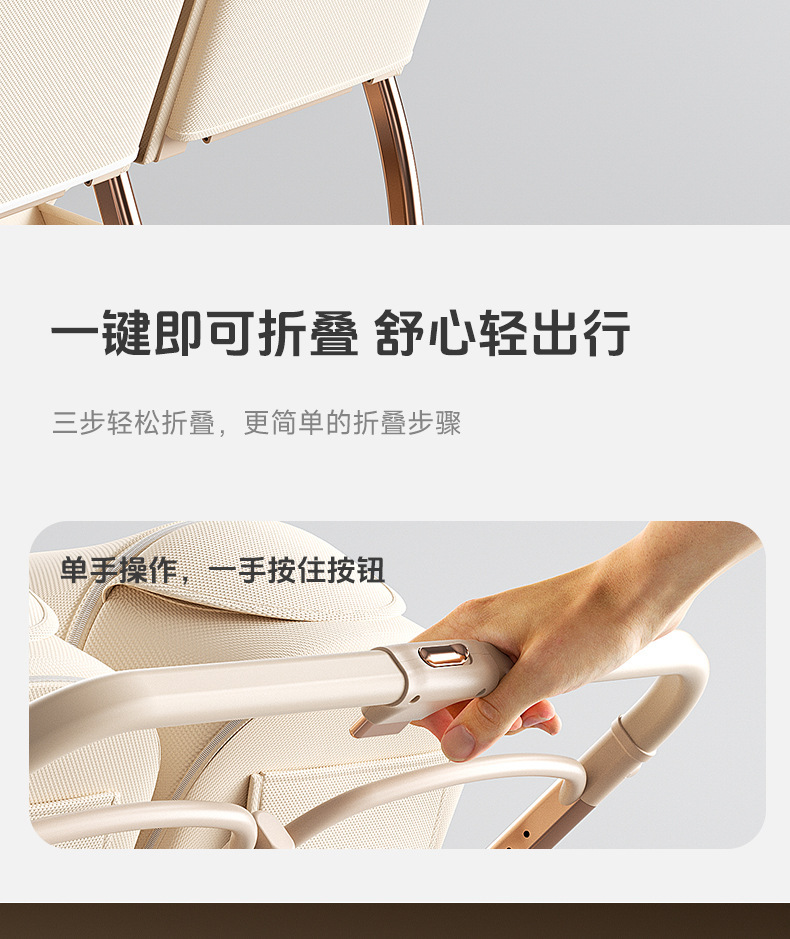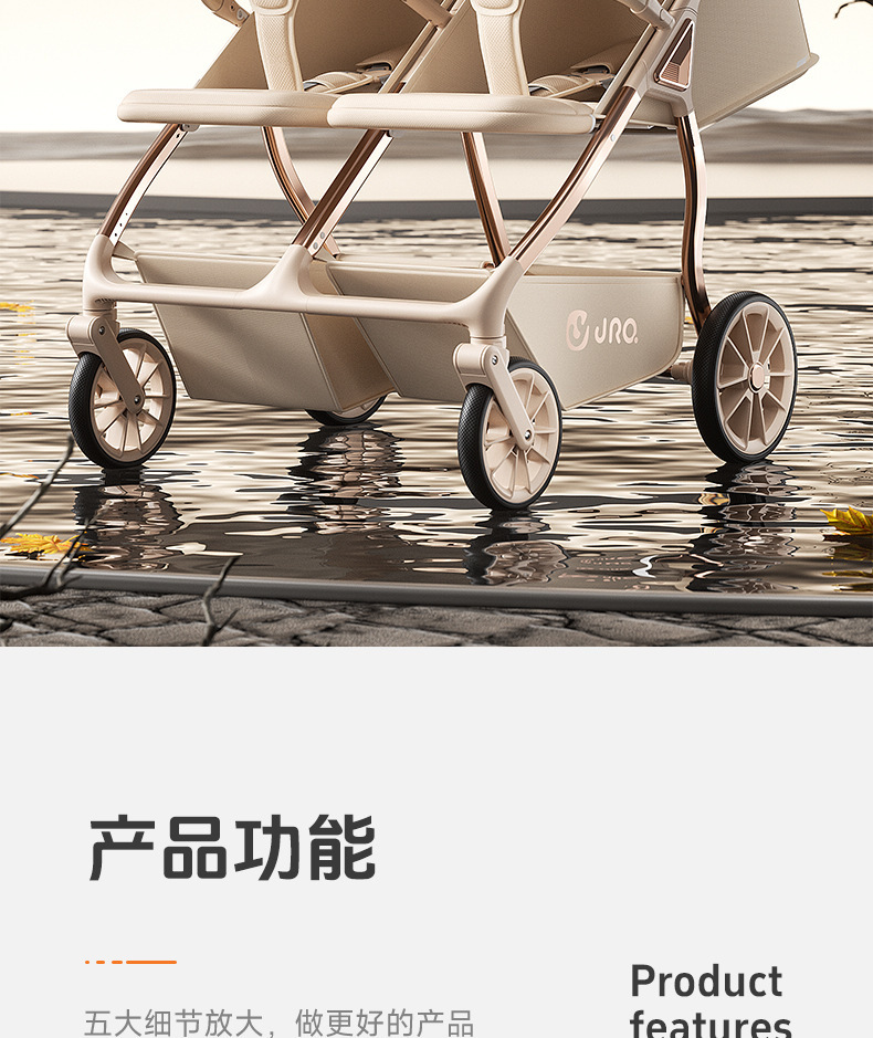 加厚加固的铝合金框架,防侧翻设计,一键式折叠,五点式安全带,加宽座椅,一脚刹车,真皮手柄,拉力绒面料,铝管材料采用氧化工艺,可调靠背,耐磨减震PU轮胎,前轮8寸,后轮10寸