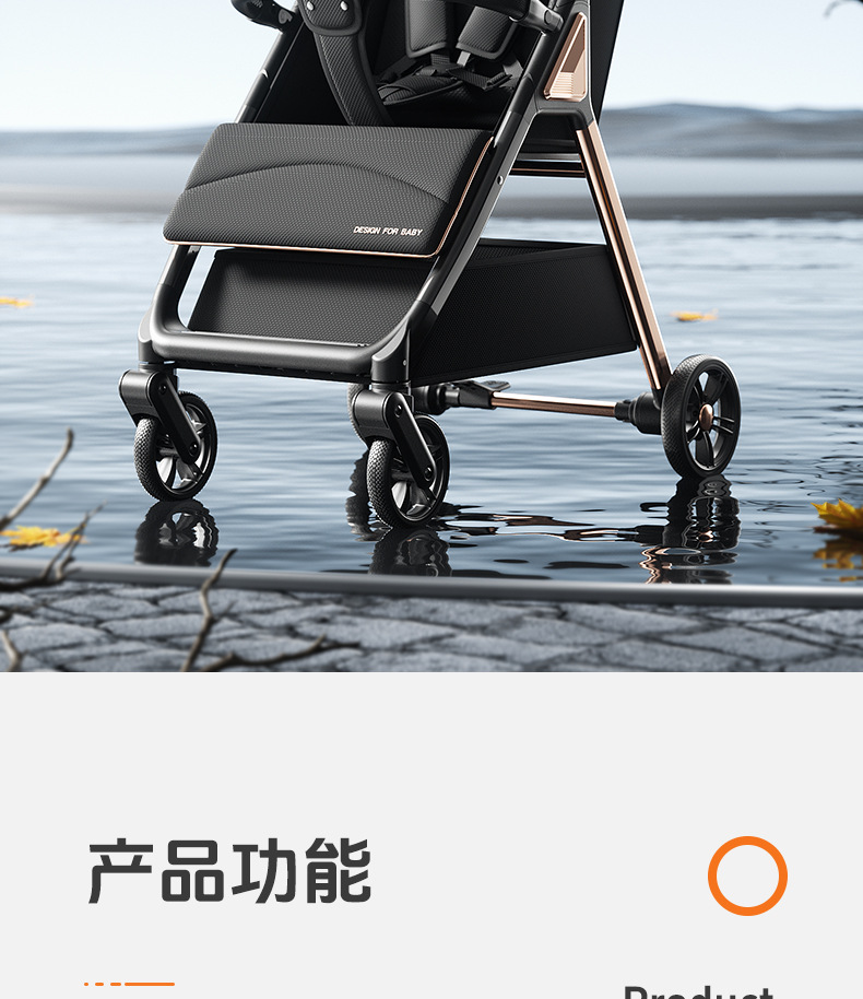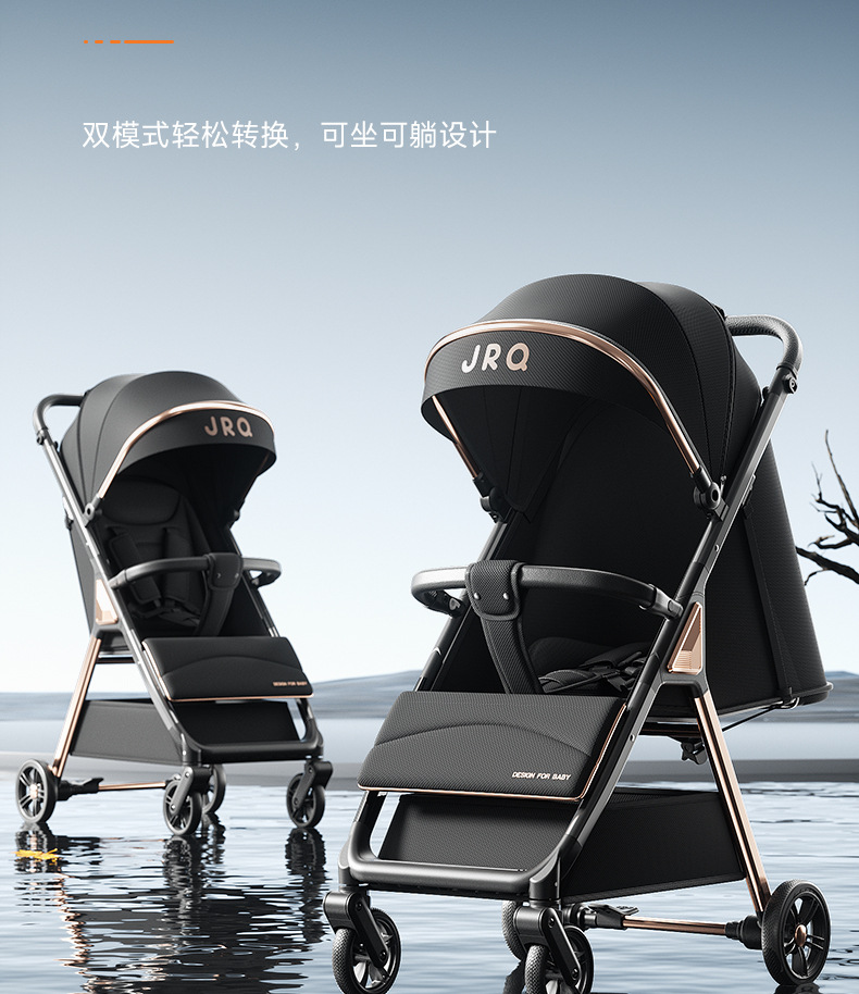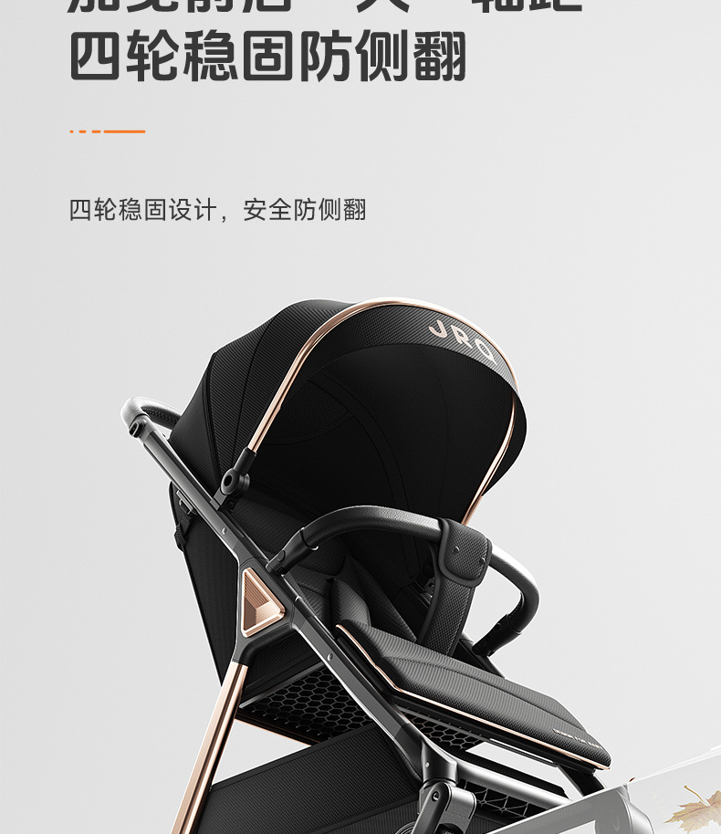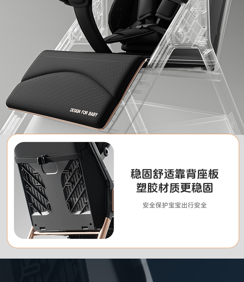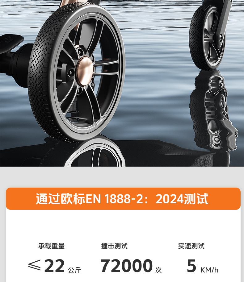 加厚加固的铝合金框架,防侧翻设计,一键式折叠,五点式安全带,加宽座椅,一脚刹车,真皮手柄,拉力绒面料,铝管材料采用氧化工艺,可调靠背,耐磨EVA发泡轮胎,前轮6寸,后轮8寸
