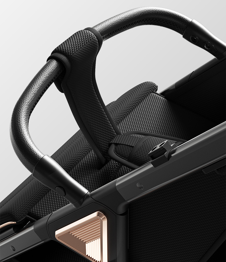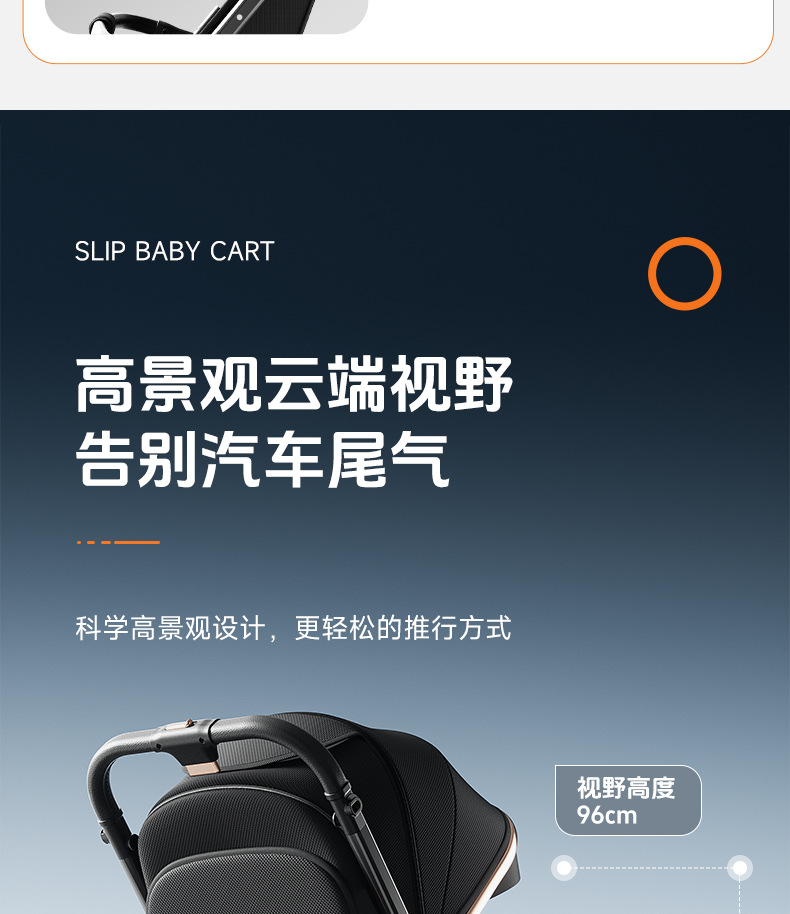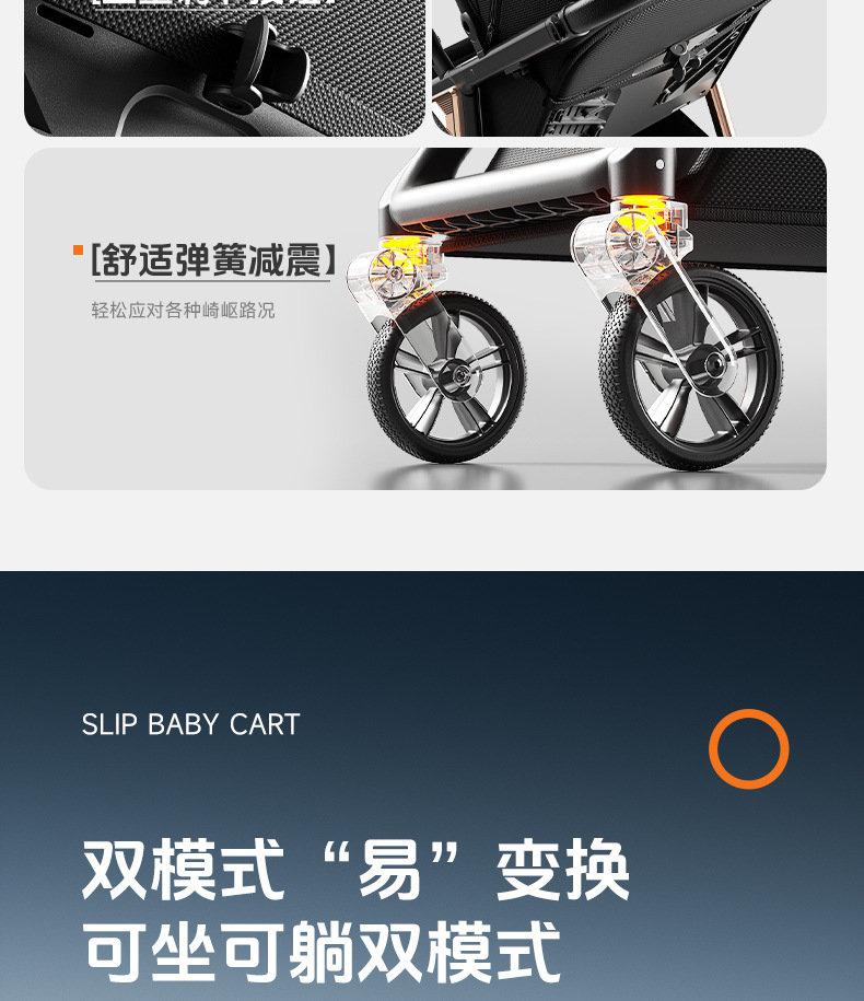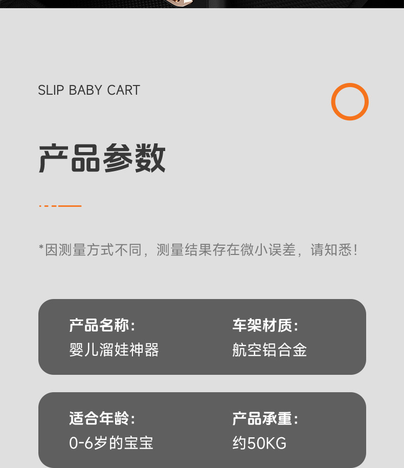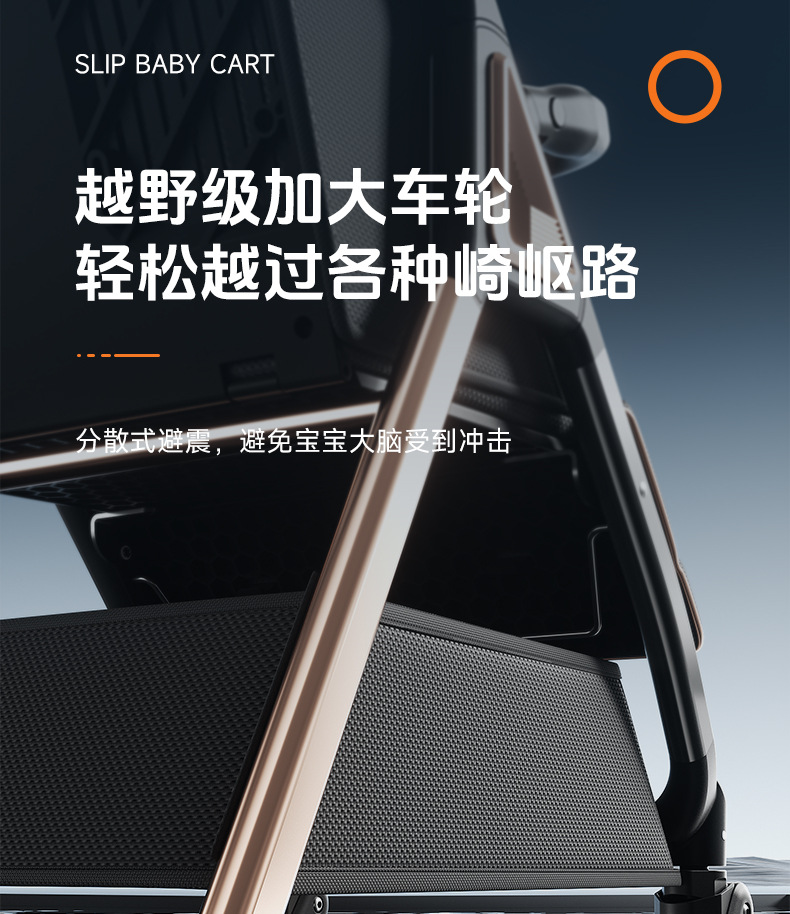 加厚加固的铝合金框架,防侧翻设计,一键式折叠,五点式安全带,加宽座椅,一脚刹车,真皮手柄,拉力绒面料,铝管材料采用氧化工艺,可调靠背,耐磨EVA发泡轮胎,前轮6寸,后轮8寸