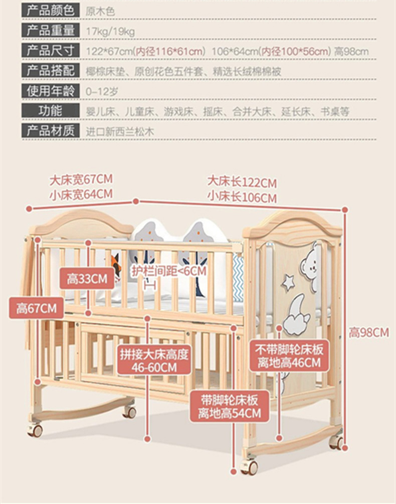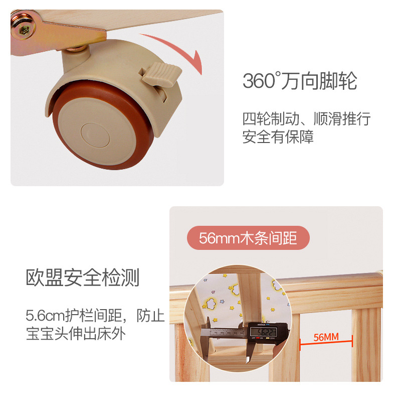 侧面护栏高61cm,栅栏间隙5cm,护栏木条加宽加厚;全实木,严格按照标准生产;